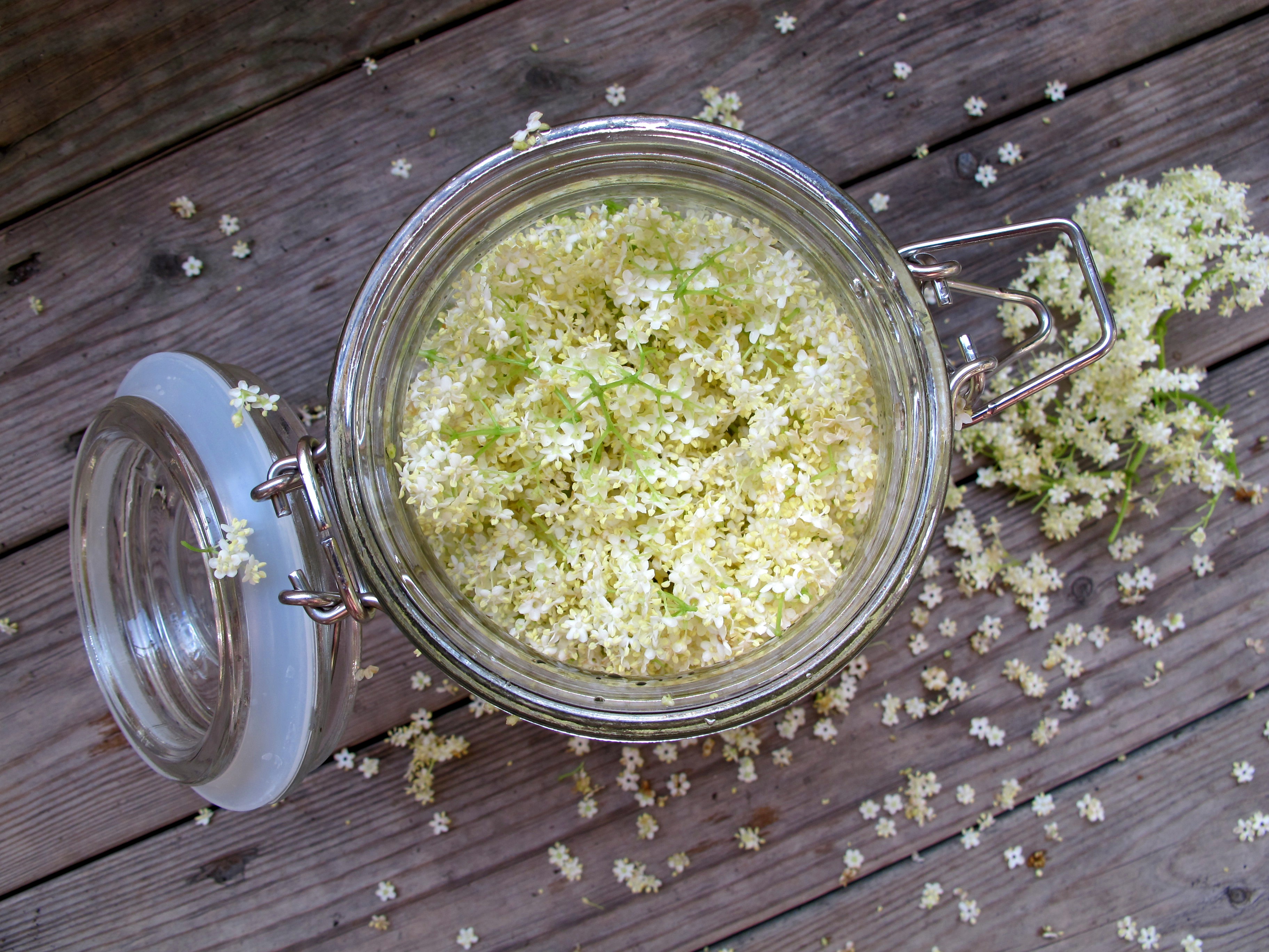 Elderflowers are typically in season during May and June. It’s best to harvest them when they are a rich, creamy color before they turn white. Ideally pick the flowers early on a dry day before the sun starts to fade their aroma. Look for flower heads with buds that are fully open, but not turning brown. Snip off the whole umbrellas and place them gently in a paper bag. The pollen contributes to the taste so transport them carefully. For maximum effect they should be used within a couple hours of picking. They don’t need to be washed but do inspect them closely and remove anything crawling or undesirable before use.