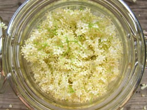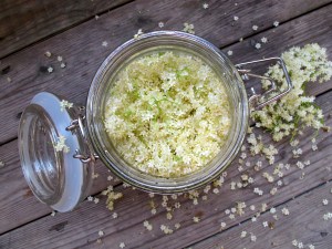 I found this elderflower liqueur recipe on Hank Shaw’s Hunter Angler Gardner Cook blog. Hank’s site is a wealth of information about what foods you can find in nature coupled with a myriad of intriguing recipes. When I found the elderflower liqueur recipe I couldn’t wait to submerge my elderflowers in a jar of vodka to see what happens. Now the waiting has begun for the finished product. But if you’re anything like me, you don’t need a final verdict to give this one a try. It’s just too seductive to pass up and I wanted to share the recipe while the elderflower season is in full swing.