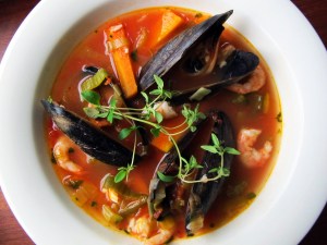 Bring the water to a low boil in a 4 quart pot. While the water is heating, peel the shrimp and put the reserved shells into the pot. Simmer the shells covered for 10-15 minutes. Strain the liquid through cheesecloth. Discard the shells and add enough water to equal one liter of liquid. Return two cups of the shrimp liquid to the pot and bring to a boil. Steam the mussels in the covered pot until they open. Check them frequently after three minutes and transfer opened mussels to a bowl. Discard any mussels that remain unopened after 10 minutes. Check the broth for sand and strain or decant if necessary. Combine the liquid with the rest of the reserved shrimp shell broth. Melt the butter in a medium saute pan and cook the leek, carrots, and celery over medium-high heat, stirring often, until carrots are crisp-tender, 5-10 minutes. Add the pressed garlic and stir until fragrant, about 30 seconds. Add the crushed tomatoes and stir well. Combine the vegetable mixture and bullion cubes with the reserved broth. Bring to a simmer and add the fish and shrimp stirring gently so the fish doesn’t break up too much. Cook for about three minutes, stirring gently, until the fish is nearly cooked through. Return the mussels and any accumulated juices to the pot, stirring gently, until just heated through. Serve with crusty french bread to soak up the flavorful broth.