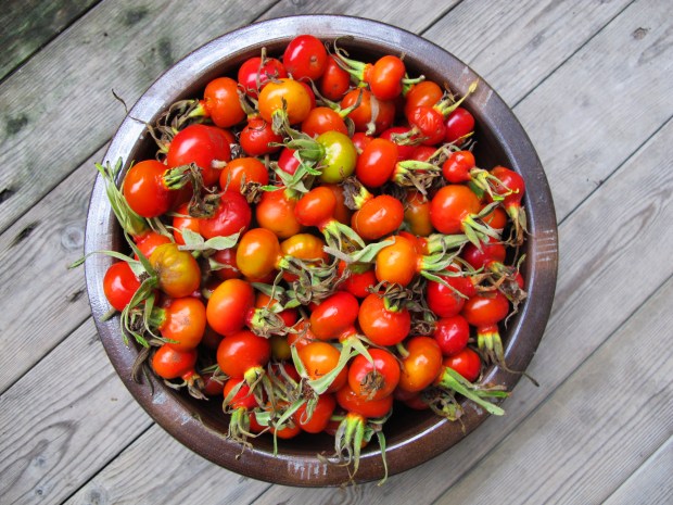 There are two common types of wild rose hips. Both are pictured above. The larger of the two are rosa rugosa (top picture), and the smaller are rosa canina but they weren’t quite ripe at the time I was doing my picking. Rose hips are sometimes referred to as oranges of the north (nordens apelsiner) because they are so rich in vitamin C. Picking them after the first frost is said to increase their sweetness. That often isn’t practical so you can alternately force the process by putting the rose hips in the freezer for an hour or so before using them. I didn’t have trouble picking the hips by hand but some people prefer to use scissors. Either way, be sure to leave some fruit for the wildlife (birds love rose hips) and try to forage from several bushes rather than gathering all of your hips from one place.