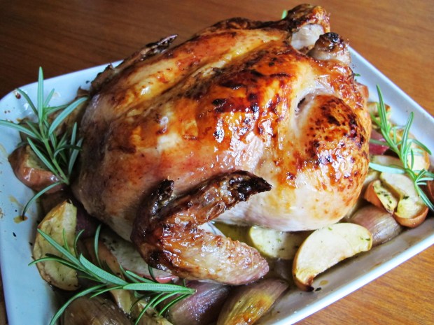 4 Comments on “Roasted chicken with rose hip glaze, herbs, apples, and shallots”