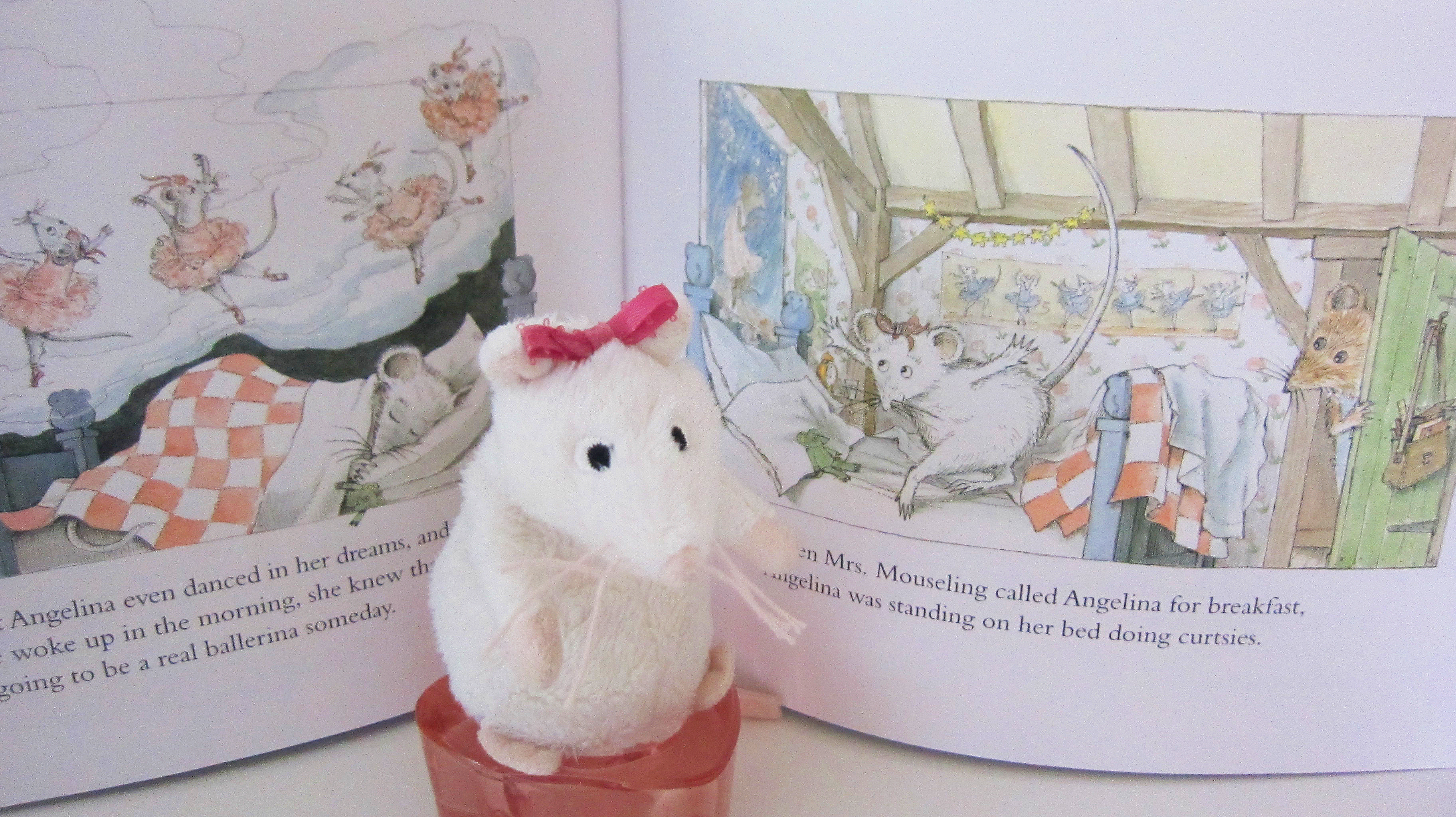 My 4-year-old is an Angelina Ballerina fan and has several books from the series. Angelina is a little white mouse with a pink bow on her head who loves to dance. One day while reading Angelina Ballerina with my daughter it came to me that I could transform her generic, IKEA white mouse (which I’ve referred to as a rat for the longest time) into Angelina.