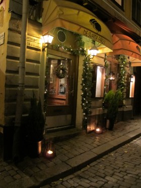 Candles, candles, candles. I have never seen so many candles. Tea lights are a regular item on everyone’s shopping list. As soon as it begins to get dark early businesses place lanterns outside their doors and some even light candelabra in their windows. Fire pots pop up on doorsteps and in public spaces. On a recent trip to Stockholm I loved the fire stands you could cozy up to and warm your hands. Open flames in public is definitely not something I grew up with in the U.S. I think people are too afraid of accidents and litigation but I have yet to hear of anyone in Sweden going up in flames because of it.