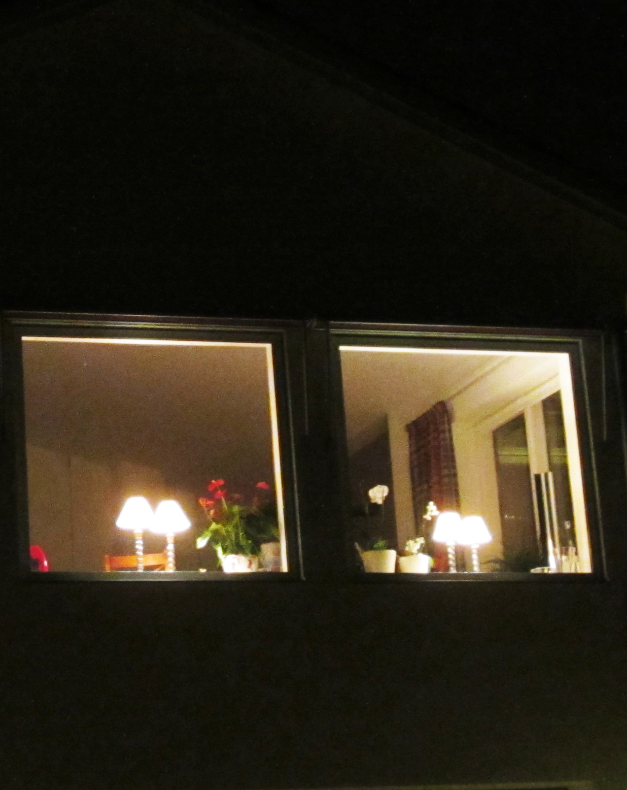 It’s a little difficult to see, but in the photo on the left, three out of the four stories have matching lights in the windows. And the photo on the right is like a double, double whammy…two pairs of matching lights. That may well be a record. It’s a bit tough to get these shots, not only for the technical challenge of taking them in the dark, but also for the freak-out factor. I would be concerned if I noticed a strange person standing out on the dark street taking pictures of my house. Which brings up an interesting difference here. People don’t seem to be particularly interested in curtains or blinds aside from the decorative aspect. They are used in bedrooms for privacy and to block out light for sleeping, but in most living spaces the blinds/curtains are left open all the time. That differs greatly from where I grew up. Each evening my mother would come in and draw the translucent curtain in the living room when it got dark and the opaque one before going to bed.
