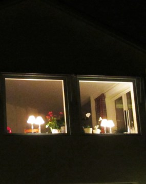 We are in a village with fields behind us, only one street light visible in front and only a few other house windows visible from ours, so I suspect that the effect of our own window lights is magnified. It is also much more pleasant to walk the dog around the village when the gloom is broken up by the lights in the house windows!