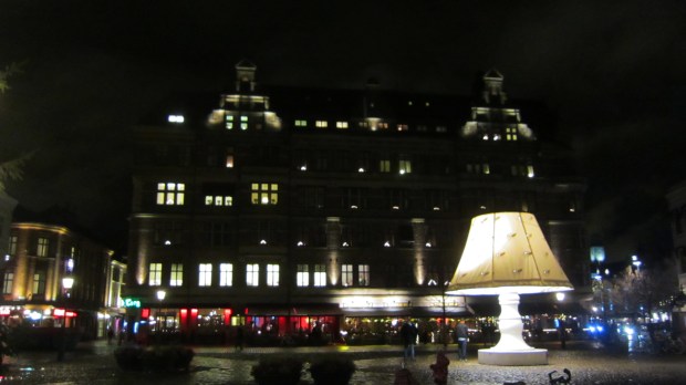 The Christmas lights will help to fray the darkness for most of the country through January, and often well into February, and candles will play a helpful role until the longer daylight hours return. But there IS one last thing you can do to counter the darkness. You can always plop a giant lamp down in the square as they do in Lilla Torg in Malmö. If they’d just get a matching one they’d be all set.