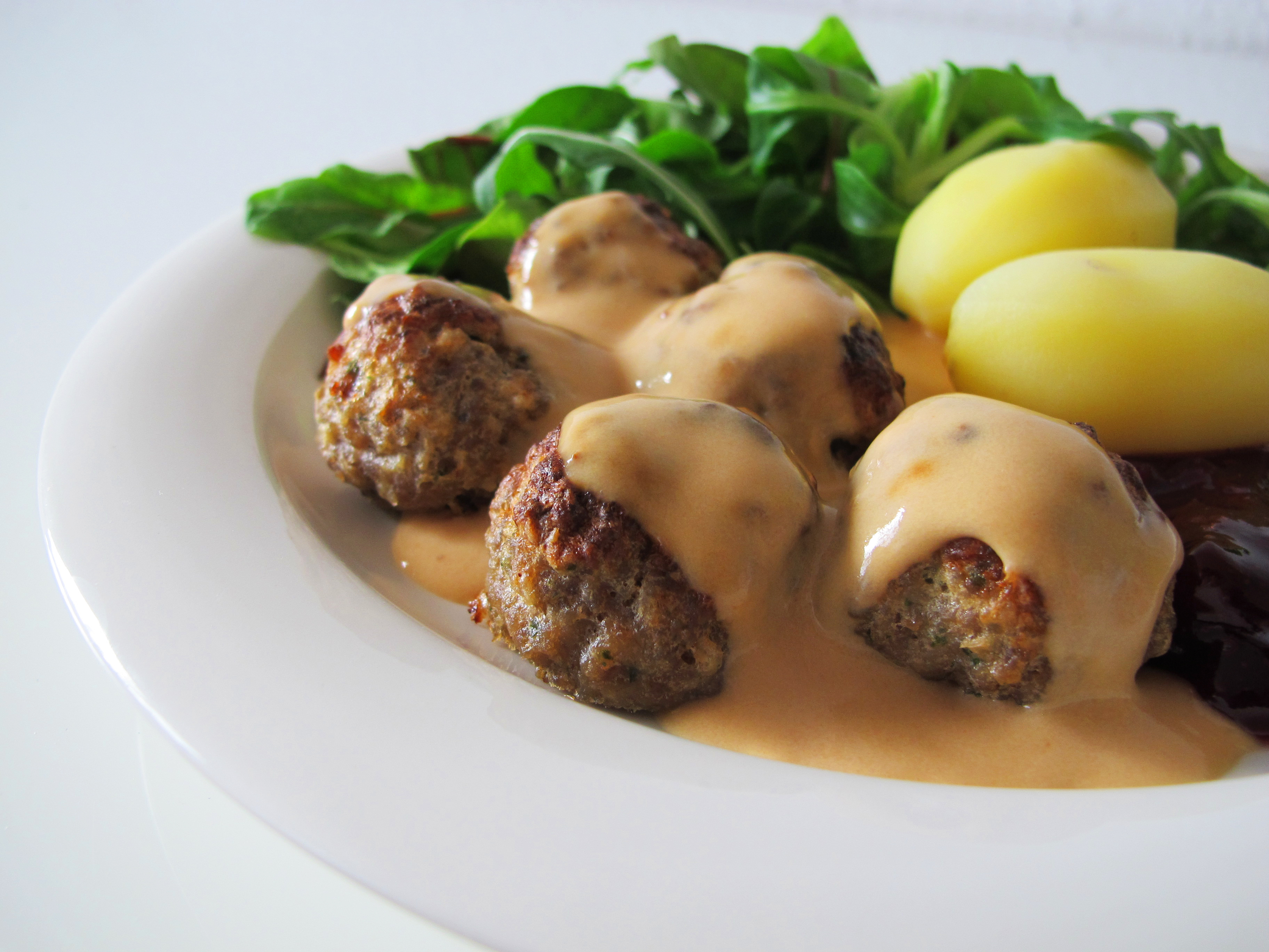 Today they are standard fare, year-round in Swedish households and restaurants. Most commonly they are served with a sauce, boiled potatoes, lingonberries, and a plain salad. They are also a mainstay of the Swedish Christmas table, or julbord. Some recipes on the internet, and my grandmother’s recipe, advocate cooking the meatballs in the sauce at some point but that is uncommon in Sweden where the sauce is generally kept separate until serving. Leaving the sauce separate allows for easier freezing of the meatballs as well as the ability to adapt them to a popular open-faced sandwich (smörgås) finished with a mix of pickled beets, creme fraiche, apples and onion. Super tasty. I promise to post a recipe at some point.