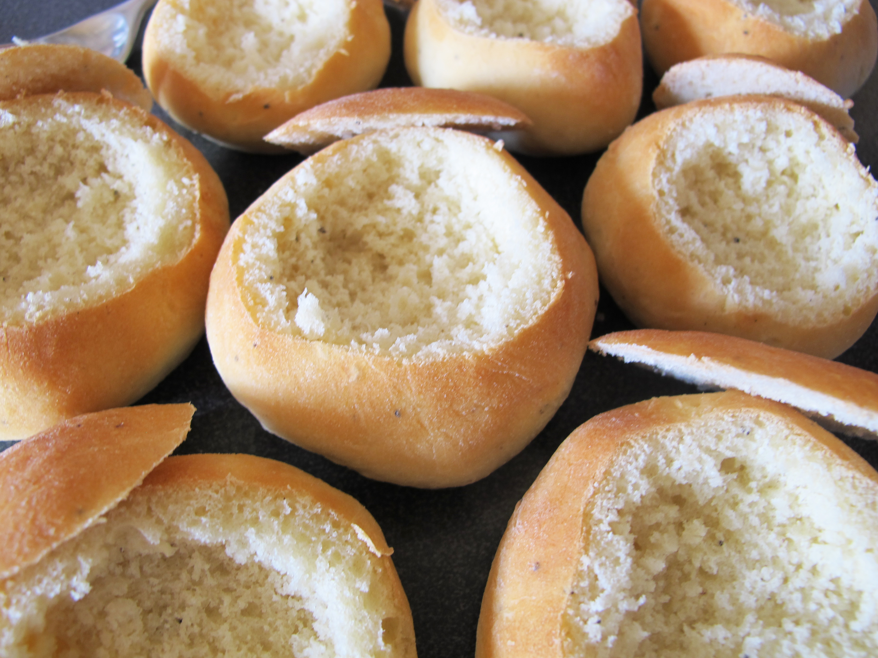 4. Bake large buns in the lower part of the oven at 390°F (200°C) for 20-25 minutes. Bake smaller buns in the middle of the oven at 435°F (225°C) for 7-10 minutes. When they are nicely browned remove them and let cool completely under a kitchen towel. The buns dry out quickly so once they have cooled to room temperature place them in an airtight container. If they dry out too much, you can wrap them in a damp kitchen towel and heat in the microwave for a few seconds. Keep an eye on the towel so it doesn’t catch on fire. The buns freeze really well so you can enjoy them for a longer period of time. Just thaw them out before continuing with the next steps of removing the lid and filling them.