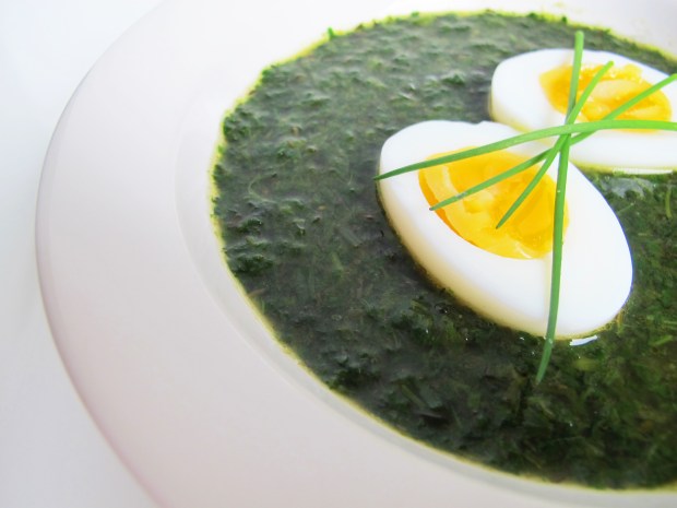 Nässelsoppa (NEHS-suhl-SOH-puh) is well-known in Sweden although not many people make it these days. Hard-boiled eggs and crème fraiche are the traditional accompaniment. Perfect for using up all of those Easter eggs. Every spring my mother-in-law gathers the stinging nettles that sprout in the patch of woods just behind her house. Early nettles are tender and perfect for cooking. Even though the shoots are small they’re still prickly little devils that can cause a stinging rash unless you wear gloves to avoid the tiny hairs that cover the plant. Packed with nutrition and flavor they have high quantities of iron, calcium, vitamin A and K. In medieval Europe they were used medicinally as a diuretic and to treat joint pain.