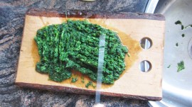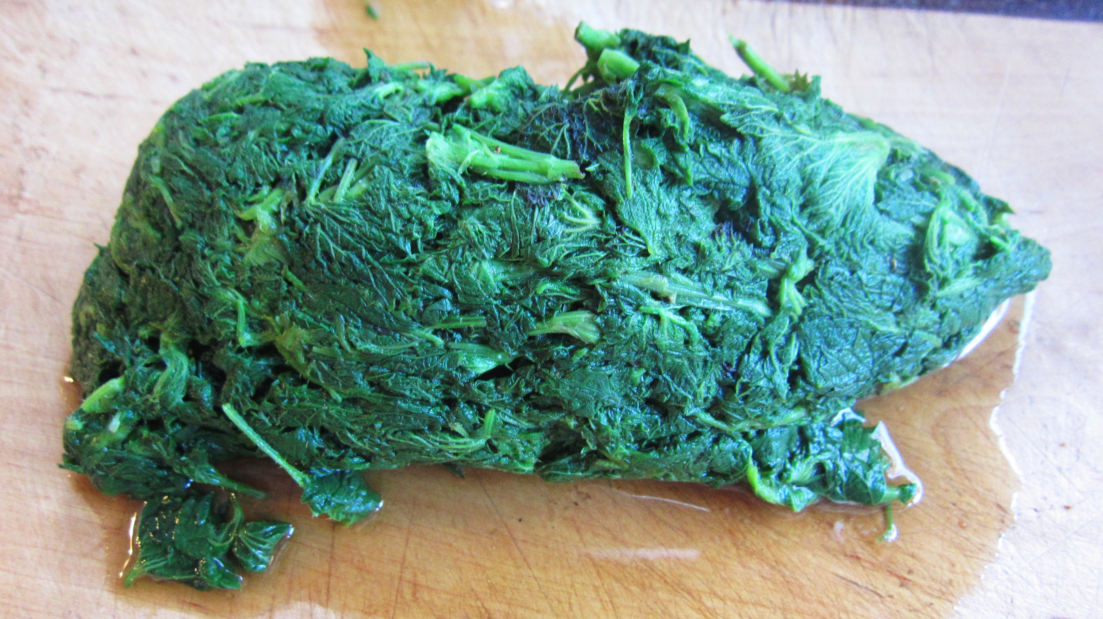 2. Place the nettles in a 2 quart (2 liter) stock pot. Add 1 cup (240ml) water and sprinkle 1 teaspoon of salt over the top of the nettles. Cover and bring to a boil. Reduce heat to a low boil and let the nettles cook for 5-10 minutes. If you are comfortable with the cleanliness of your nettles, strain off the cooking water and save it, pressing gently on the nettles to release more of their liquid. Otherwise discard the cooking water. Place the cooked nettles on a cutting board.