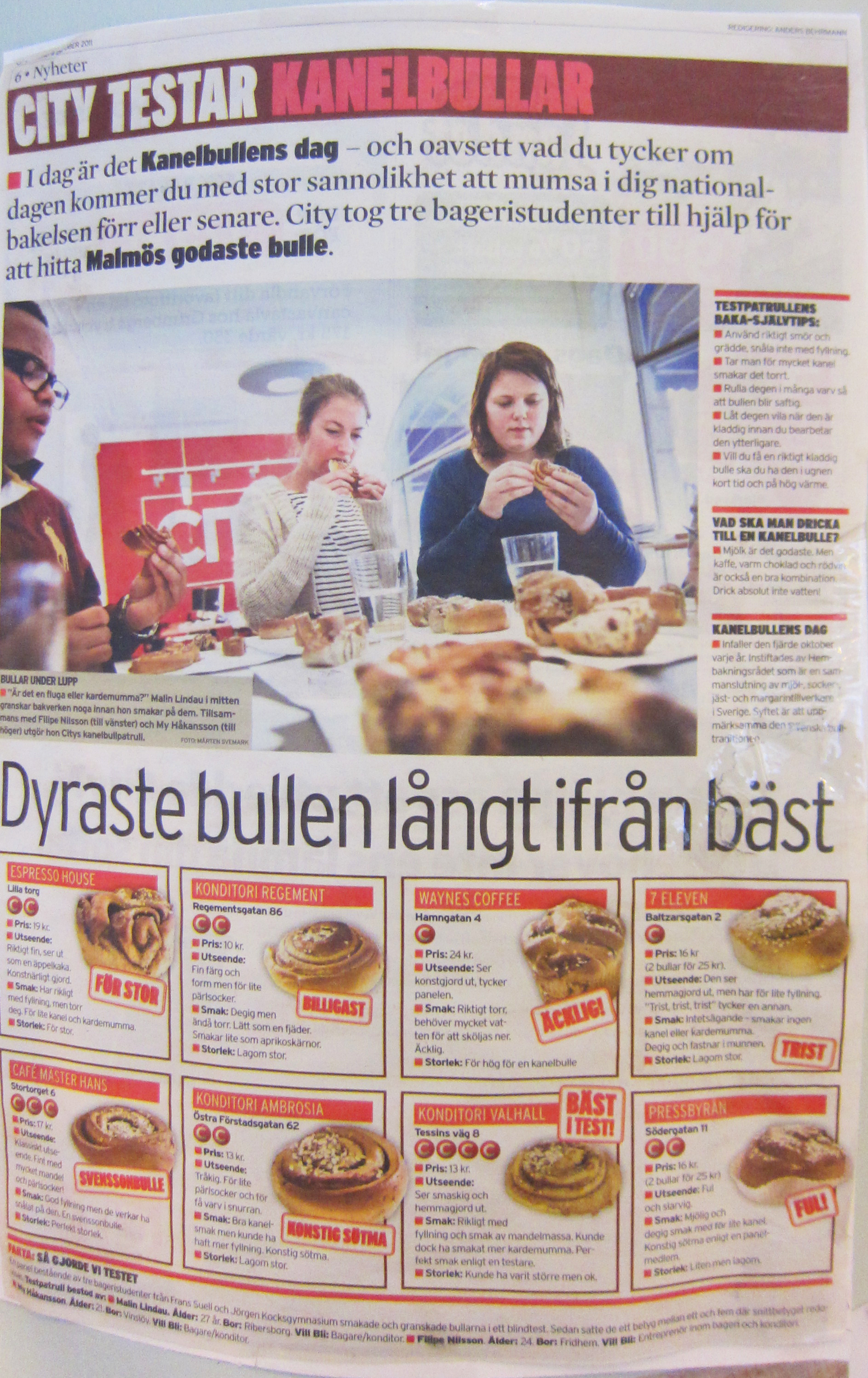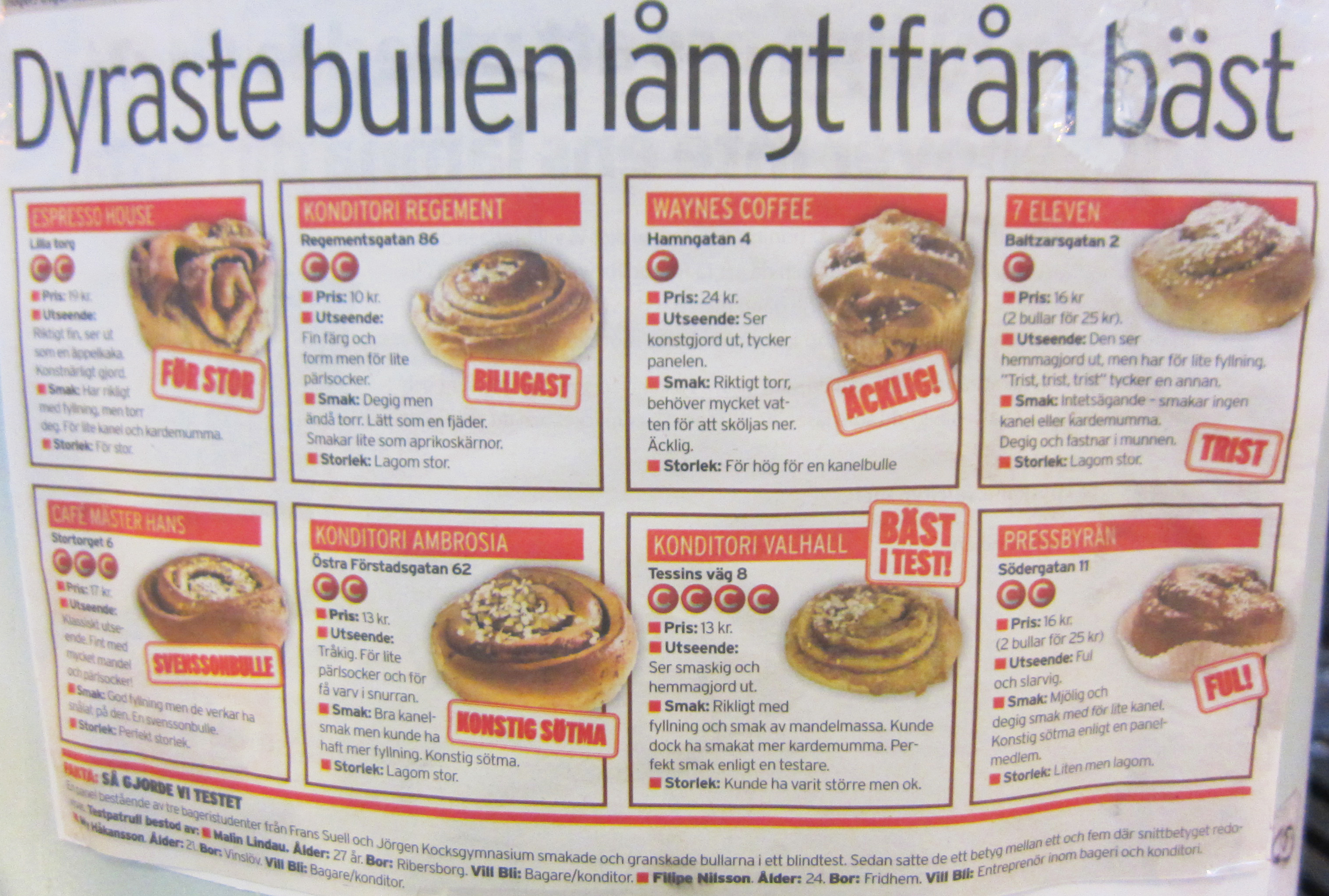 Dyraste bullen långt från bäst (most expensive cinnamon bun is far from best). För stor (too big), billigast (cheapest), äcklig! (gross!), trist (boring), svenssonsbulle (I have no idea what that means), konstig sötma (strangely sweet), bäst i test! (best in test!), ful! (ugly!)