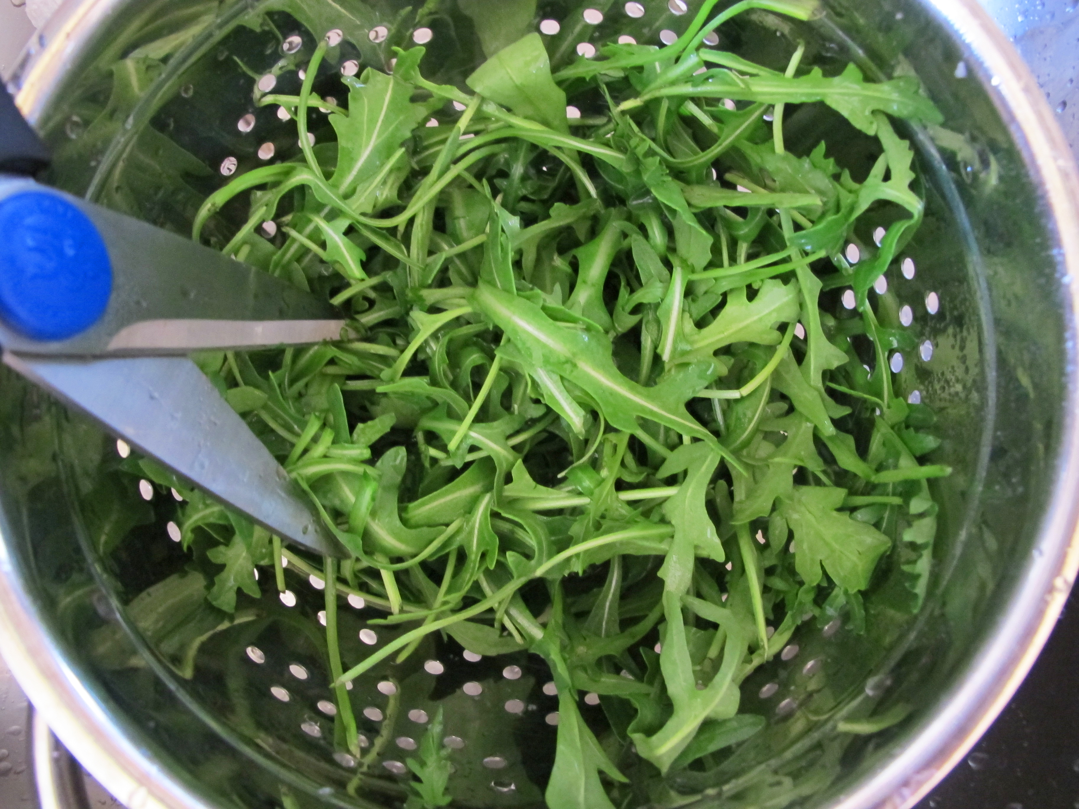 4. While the soup is simmering, rinse the arugula in a small colander and chop it directly in the colander using kitchen shears. After the soup has finished simmering, add the arugula and stir just until wilted, about 1 minute. Season to taste, drizzle with olive oil and serve.
