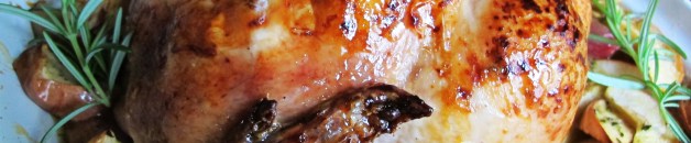 Roasted chicken with rose hip glaze, herbs, apples, and shallots